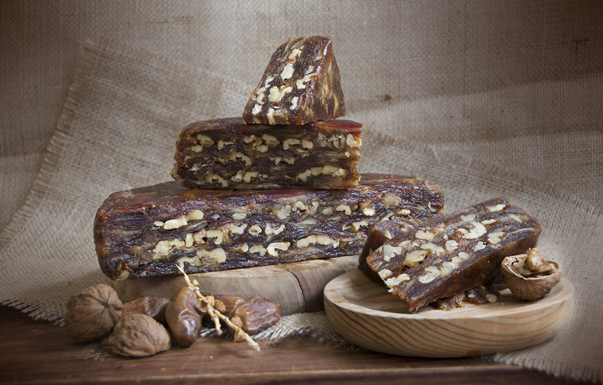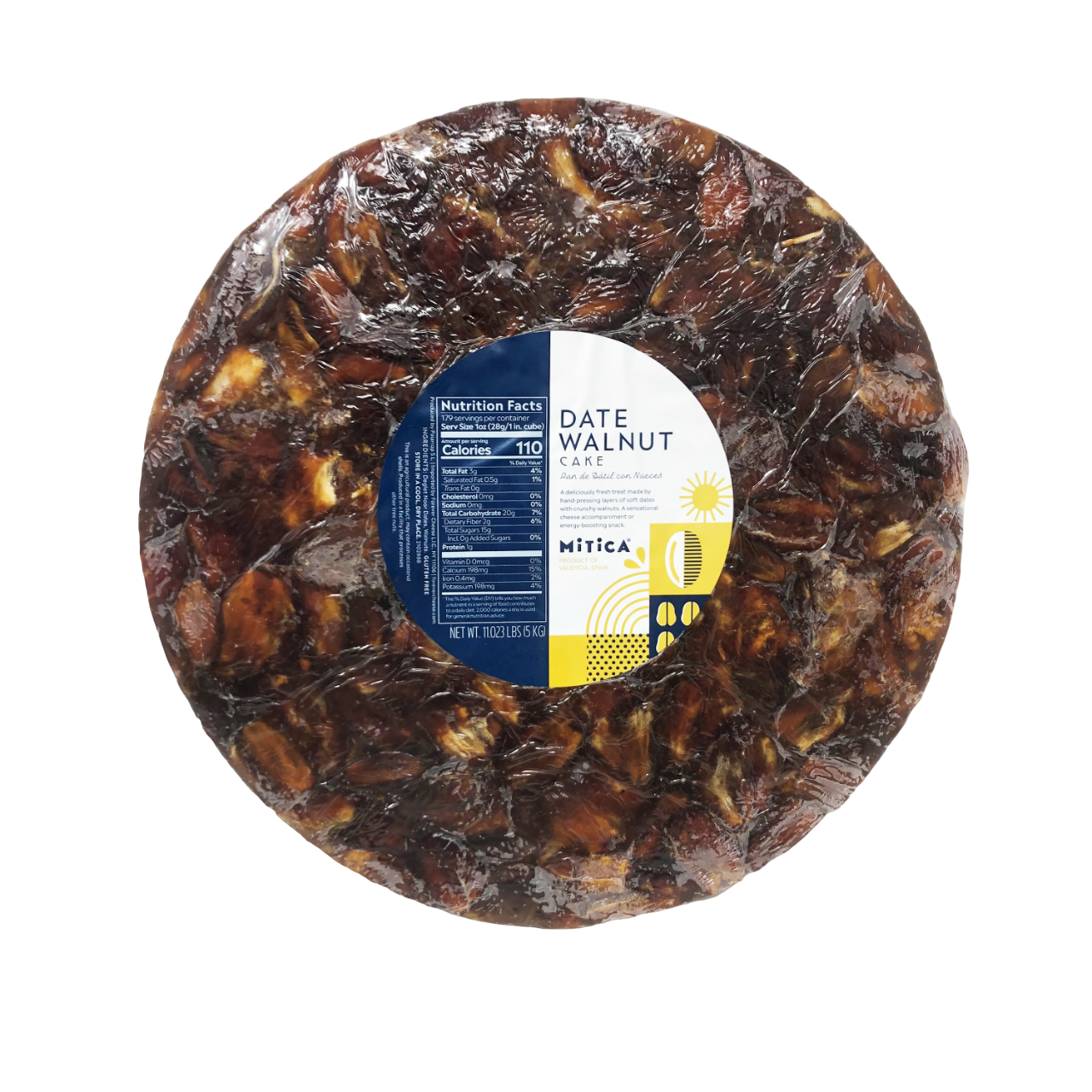 An artisanal Spanish cake made with just whole Deglet Noor dates and walnuts. The dates are soft and sweet and the walnuts add savory crunch. Each cake is formed by pressing layers of fruit and nuts together, with no additives or preservatives. Excellent paired with cheese, eaten as dessert, or as an energy-boosting snack.