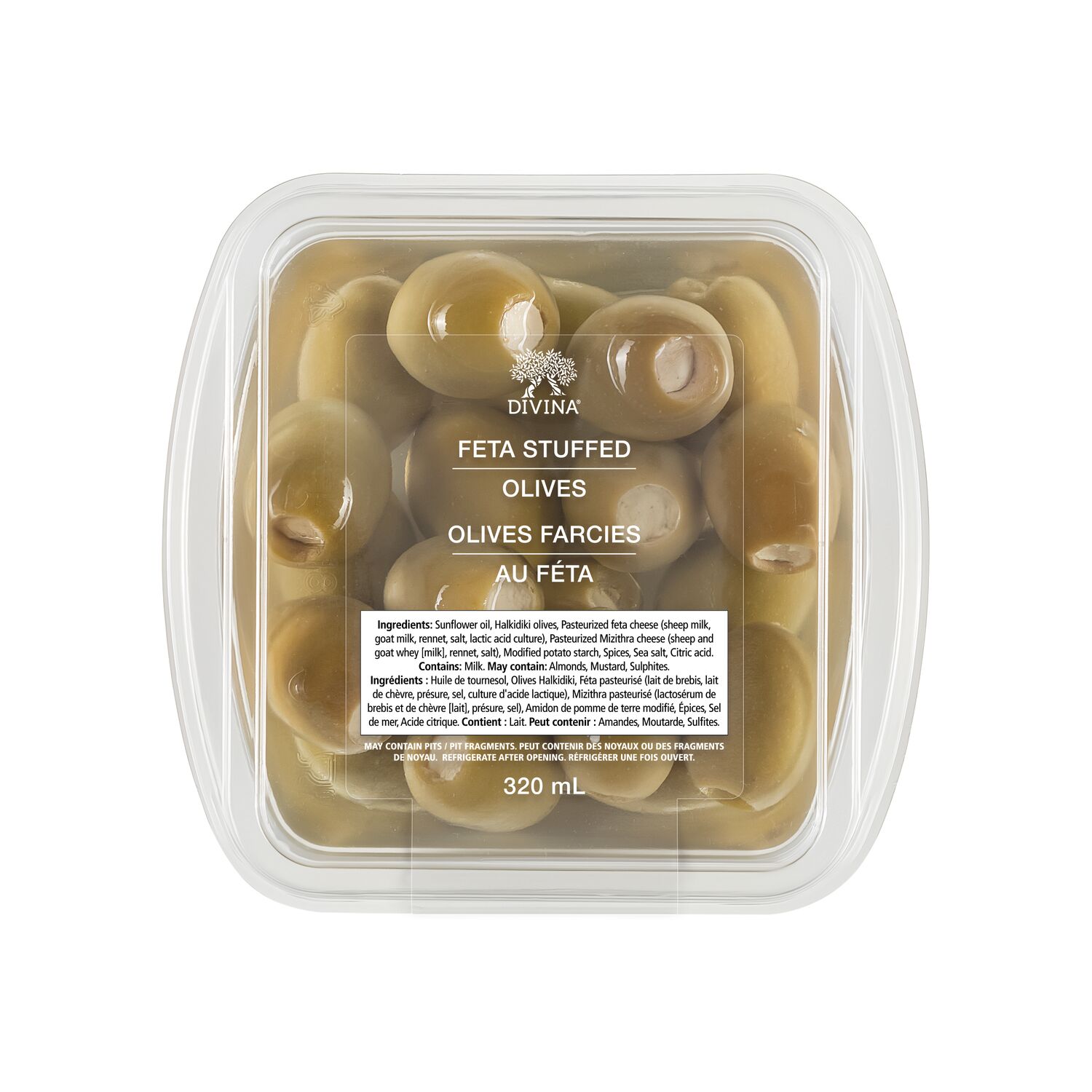 Sunflower oil, Halkidiki olives, Pasteurized feta cheese (sheep milk, goat milk, rennet, salt, lactic acid culture), Pasteurized mizithra cheese (whey, sheep milk, goat milk, rennet, salt), Modified potato starch, spices, Sea salt, Citric Acid.