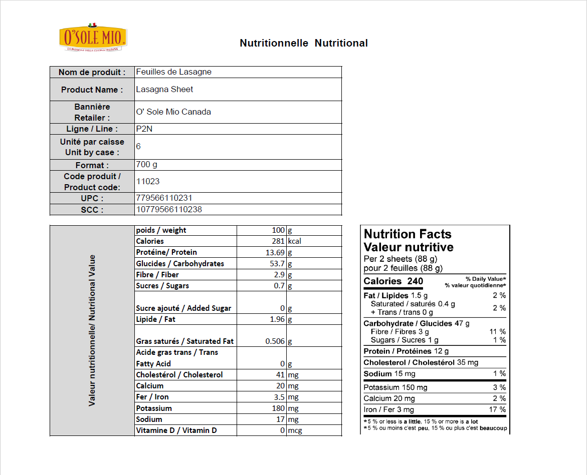 Lasagna Sheet Lasagna sheet – Oven ready – No boiling Product Info Nutritional Info Ingredients Durum wheat semolina, Liquid whole egg, Water. Variants Certifications Product Gallery