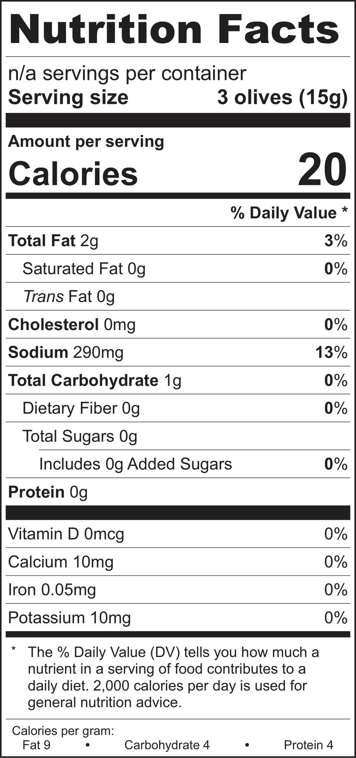 Greek olives, water, sea salt, sunflower oil, citric acid. Spice packet enclosed (dried garlic, spices).