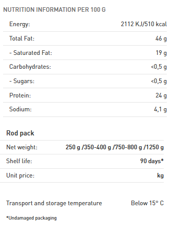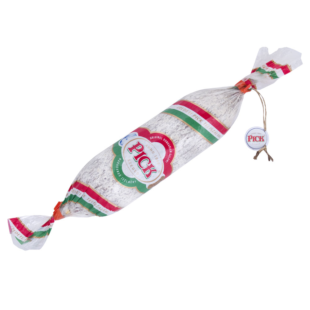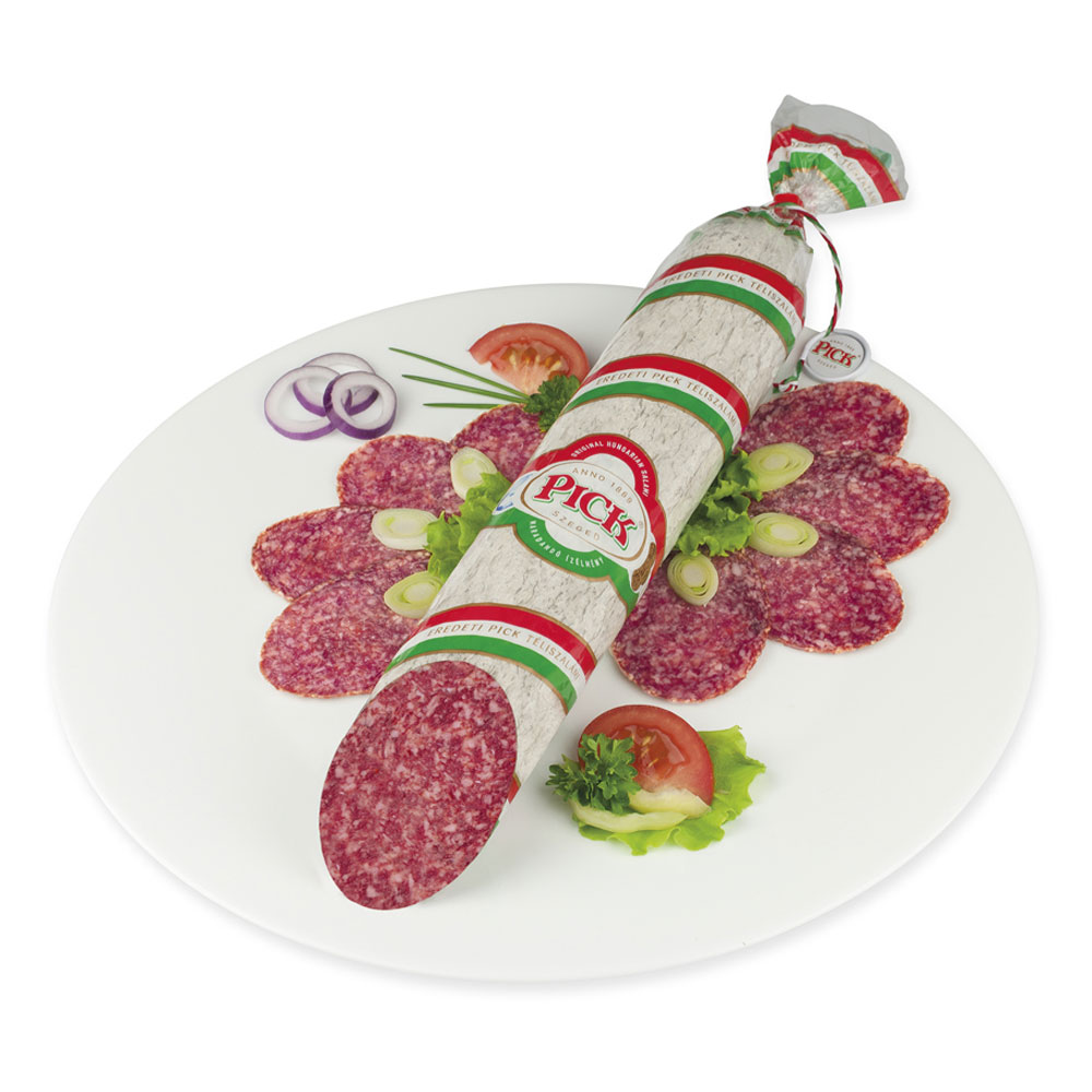 The PICK Winter Salami is a smoked and dry cured salami made from excellent, premium quality, natural ingredients with classic seasoning. The up-to-date production technology creates a perfect, unbeatable combination for decades with the traditional, beech wood smoking and long aging process. The harmonious flavour of the product is mainly helped by the mould coating, which is protected by the cellophane packaging of the salami.