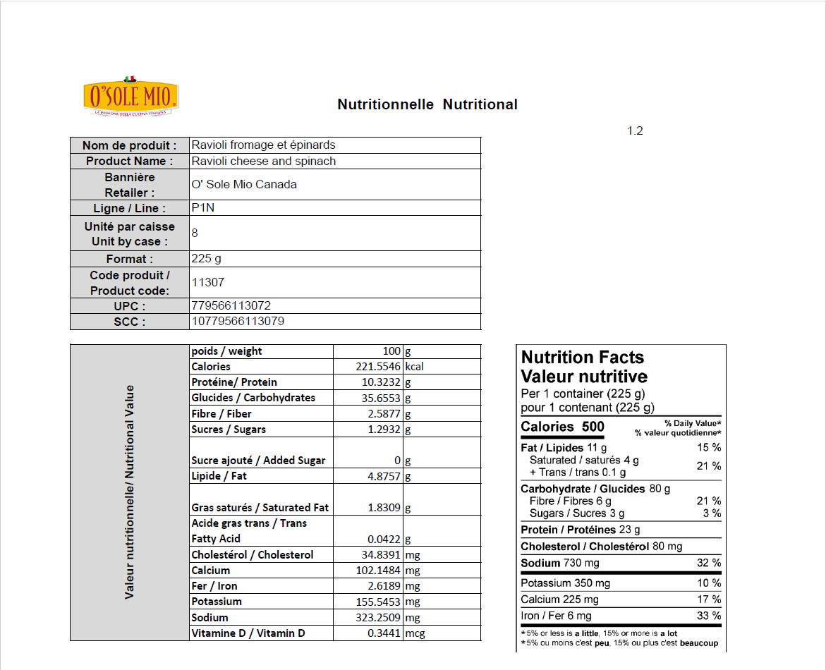 Pasta (durum wheat semolina, flour, liquid whole egg, water), Filling (ricotta cheese (whey, milk, bacterial culture, salt, citric acid), toasted wheat crumbs, milk, spinach, water, imported hard ripened cheese (milk, salt, microbial rennet, lysozyme (egg)), imported grana padano DOP cheese (milk, salt, rennet, lysozyme (egg)), canola oil, flour, oat fiber, durum wheat semolina, salt, modified corn starch, granulated garlic, liquid whole egg, spices).